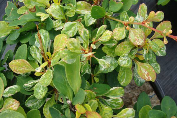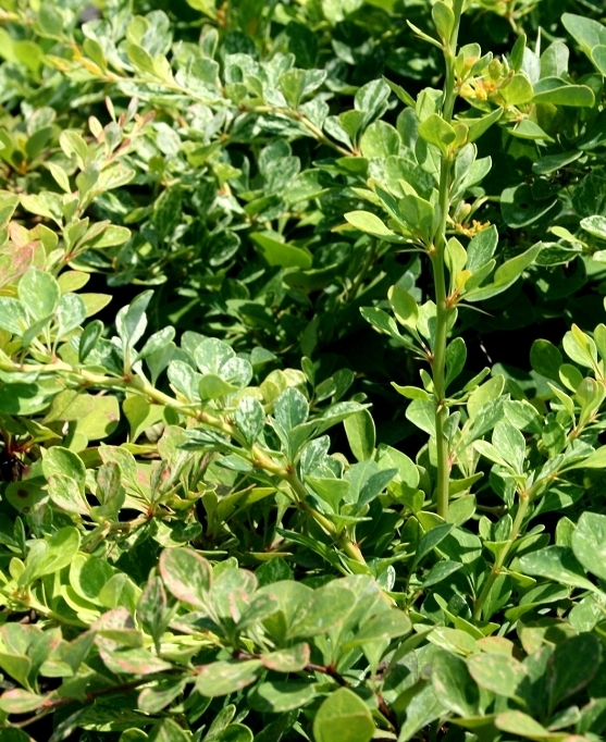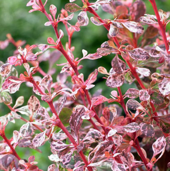 Саженцы кустарника барбариса Боум (Boum) – совершенно новый сорт, отличающийся медленным ростом и красивой полушаровидной кроной. Ширина и высота взрослого растения примерно равны друг другу и составляют около 600 см. Листья растения зеленые с белыми вкраплениями, а осенью они приобретают розовые, красные и оранжевые оттенки. Крупномеры барбариса Боум часто используют в качестве живых бордюров, в посадках группами или в альпинариях. В весеннее время в почву вносят азотные удобрения, после чего удобряют по 3 – 4 раза в год. Также требуется вносить комплексные удобрения, в составе которых есть микроэлементы. Эти низкорослые кусты можно не подстригать и они помогут выгодно зонировать участок.