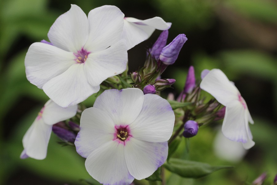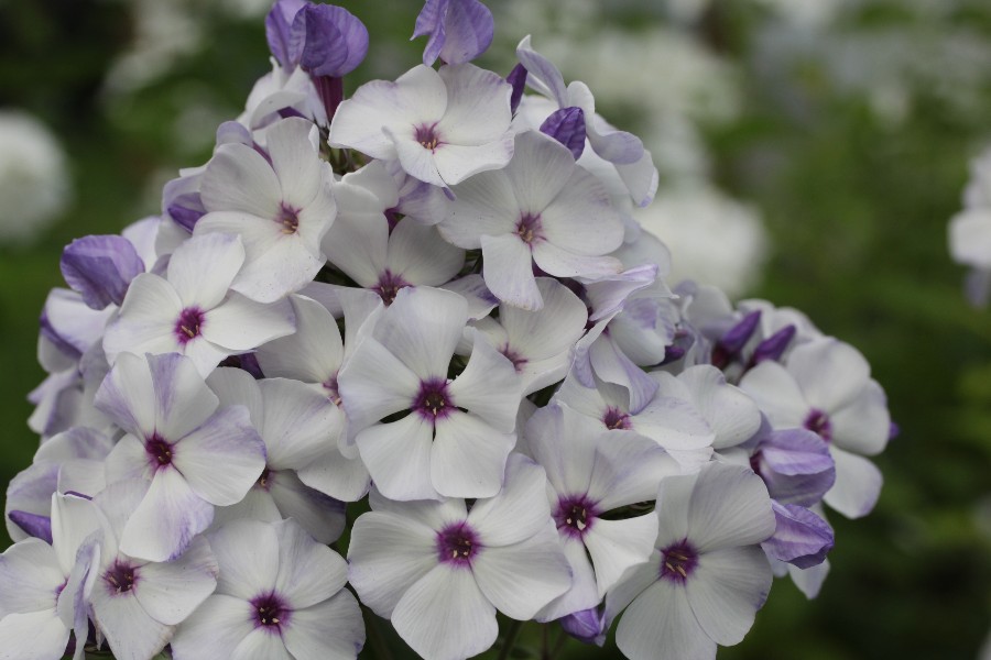 Рассада флокса метельчатого Чайка понравится любителям нежных соцветий. В летний период на кустах появляется множество белых цветов с фиолетовой серединкой, лепестки которых покрыты легкой голубоватой дымкой. Этот сорт универсален в использовании и подходит для составления праздничных букетов.