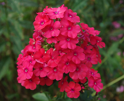 Рассада флокса метельчатого Мисс Мари (Miss Mary) наполнит сад очень привлекательными пышными соцветиями и ярко-зелеными компактными кустами, которые неплохо смотрятся в клумбах контейнерного типа. Цветки у растения красно-малиновые с небольшим сиреневым колечком в центре. Подходят для срезки в букеты, но цвет их становится сиреневато-красным.