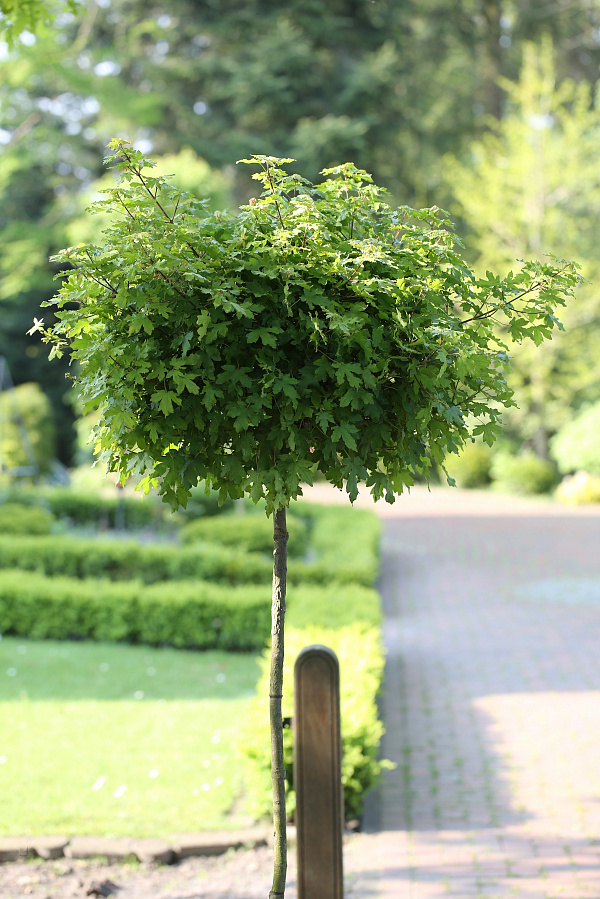 Саженцы клена полевого Нанум (Nanum) – сорт листопадных деревьев с изысканной естественной геометрией крон. На стройных прямых стволах молодых крупномеров эффектно покоятся круглые шапки из зеленой листвы. Взрослое растение вырастает в 2-3 м высоты. С возрастом крона становится более раскидистой и рыхлой. Цветет дерево мелкими желтыми соцветиями. Плодоносит клен полевой Нанум семенами-крылатками. Достоинства: