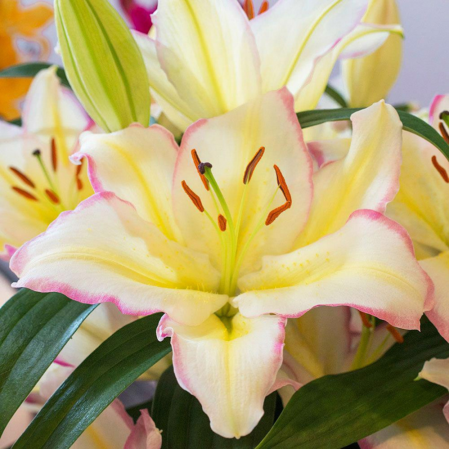 Луковицы лилии восточной Капитан Триколор (Lilum oriental Captain Tricolor) — решение для любителей пастельных тонов и необычных сочетаний. Это высокое растение, до 120 см в длину, популярное для украшения клумб и выращивания под срезку. С уходом за ним справится даже новичок: кусты отлично переносят жару и морозы, легко остаются зимовать в открытом грунте, под укрытием. В середине и в конце лета начинают распускаться бутоны — они достигают 18–20 см каждый и появляются в больших количествах на всех цветоносах. Цветы сразу привлекают внимание необычным окрасом и ярким ароматом. Они белые, с волнистой малиновой каймой и желтой продольной полосой в центре. Образ дополняют контрастные темные пыльники.