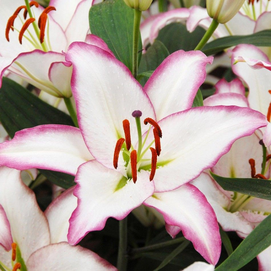 Саженцы и рассада восточной Лилии Зе Эдж (Lilium oriental hybrids The Edge) – неприхотливый посадочный материал. Со временем на рыхлых плодородных почвах и регулярном поливе он превращается в настоящую восточную красавицу, крупные цветки которой пестрят экзотическими красками. На белоснежном фоне каждого лепестка прослеживается зеленоватая жилка у основания, а края лепестков оформлены в ярко-розовом оттенке. При высадке таких многолетников высотой порядка 90-110 см необходимо подумать какие растения использовать в качестве их фона, а какие расположить рядом. Здесь может быть множество вариаций, поэтому смело экспериментируйте.