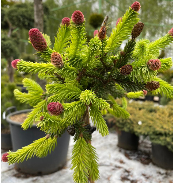 Ель обыкновенной Акрокона Пуш на штамбе отличается красивыми шишками, которые в период распускания имеют нежно-розовый или красно-фиолетовый цвета. Эти шишки маленькие и появляются на отростках текущего и прошлого года. Ель используется для альпинариев, рокариев и низкорослых хвойных групп.