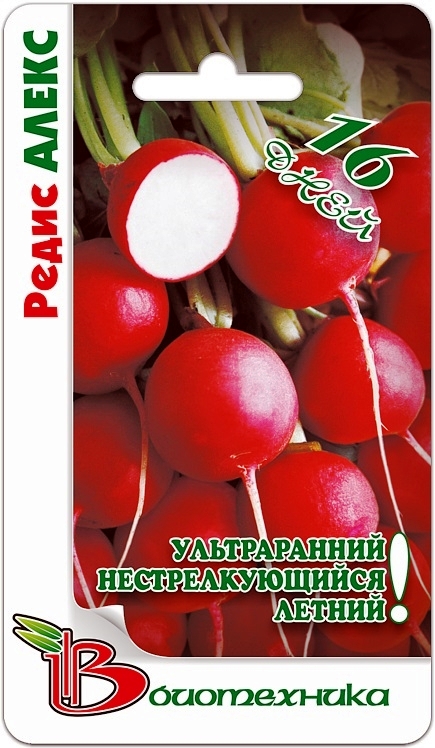 Семена редиса "Алекс F1" (Aleks F1) высевают прямо в грунт с апреля по июль. Это суперранний сорт. От появления первых всходов до момента массовой уборки урожая проходит всего 16-18 дней. Корнеплоды имеют аккуратную округлую форму. Сверху они окрашены в характерный яркий малиново-красный цвета, а мякоть белоснежная. Масса одного редиса достигает 15-20 грамм. Корнеплод отличается великолепными вкусовыми качествами, горечь отсутствует. Такой овощ прекрасно подходит для приготовления свежих салатов. Урожайность с 1 кв. м составляет от 1,8 до 2,2 кг.