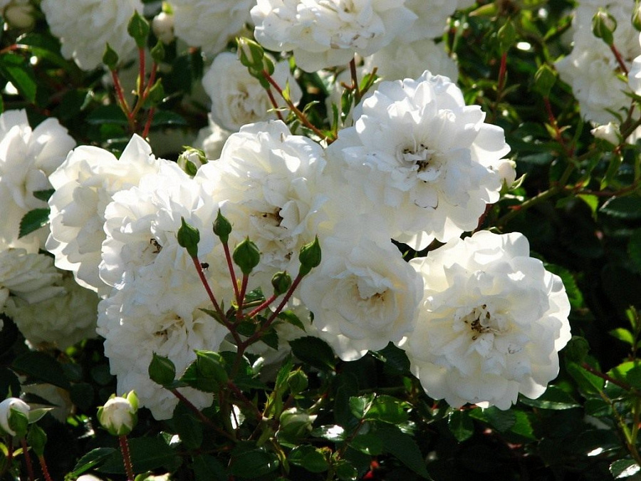Саженцы розы почвопокровной Sea Foam идеально подходят для невысокой живой изгороди, использования как почвопокровного растения или создания каскада на склоне. Культура хорошо растет в полутени и на не очень богатых почвах. Высота куста 60-100 см, а ширина – 100 см. Цветы появляются на колючих, длинных, поникающих побегах в больших соцветиях. Бутоны небольшие, диаметром 5-6 см, бело-кремовые с небольшой розовинкой. Цветет роза почвопокровная Sea Foam с конца мая и до осенних заморозков.